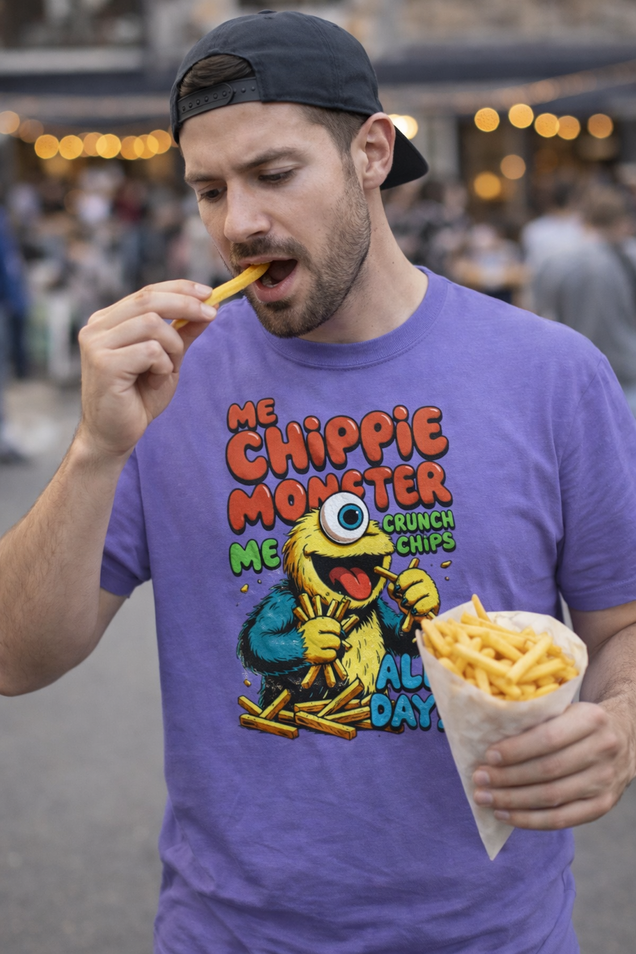 Crunch into something playful. This tee wears like a wink to snack-obsessed kids of the night: fried potato turned chippie-monster, Fried Potato inJapanese back print, and a soft, worn-in feel that encourages repeat wear. Picture slipping it on for late-night arcade runs, junk food joint hangs, or a laid-back meet-up with other food fanatics — it’s casual, a little absurd, and unmistakably fun. The graphic sits bold on the back so your crew sees it coming; the crew neckline and classic fit keep the silhouette simple so the art does the talking. It snuggles into everyday outfits — layered under a denim jacket, paired with joggers, or worn by itself while you hunt down the next great snack spot.