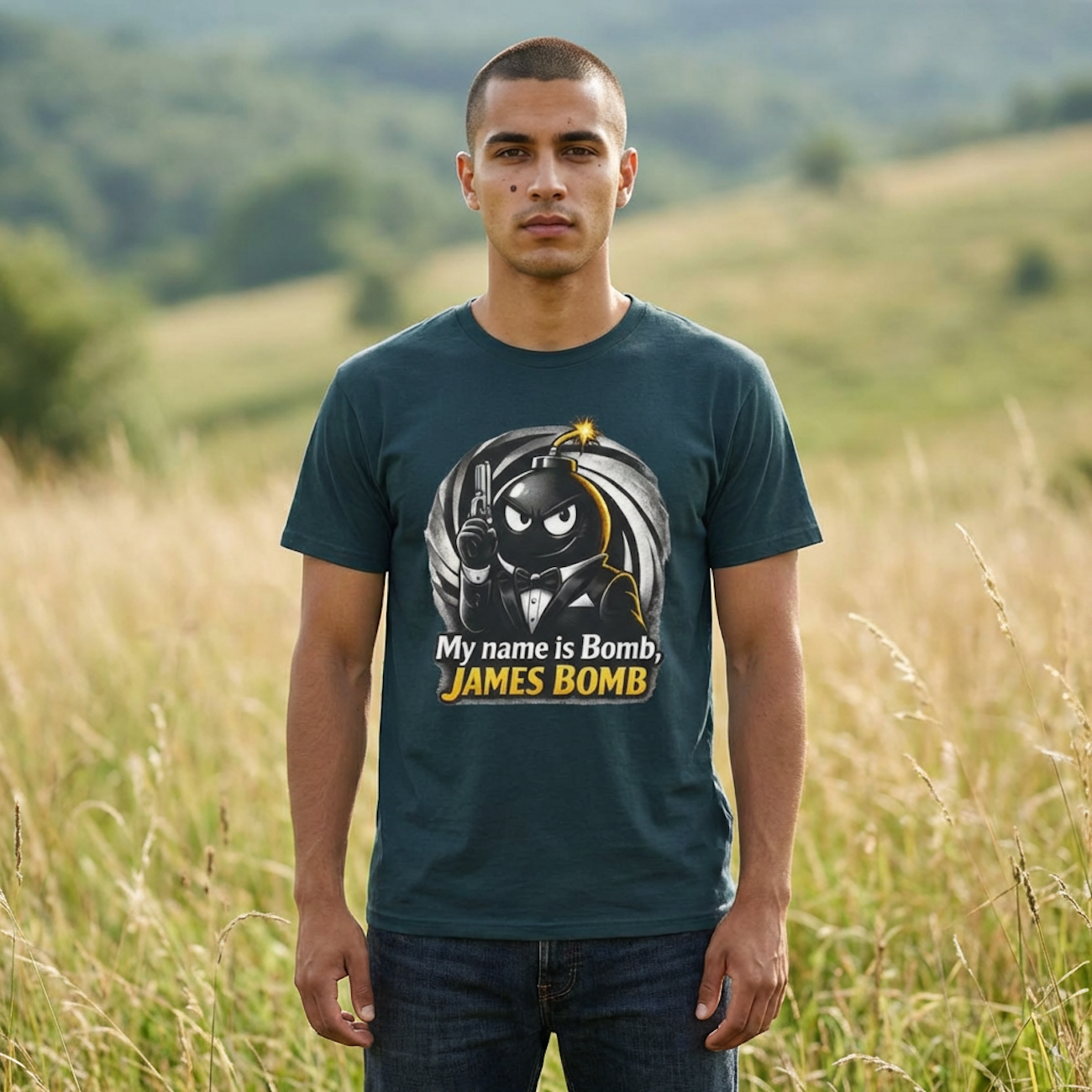 James Bomb Graphic Tee — "My name is Bomb, James Bomb" Funny Spy Parody T-Shirt